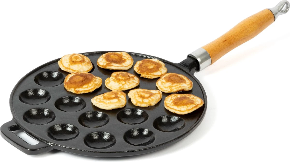 Bak makkelijk en snel poffertjes met de gietijzeren Blackwell Poffertjespan. Door het gietijzer worden de poffertjes snel en geleidelijk warm, wat voor een perfect resultaat zorgt. De poffertjespan is geschikt voor alle warmtebronnen en dient na afloop met de hand schoongemaakt te worden.De pan heeft een diameter van 24 cm en ruimte voor 19 poffertjes. De houten steel wordt er los bijgeleverd. Draai voor gebruik zelf het houten handvat op de pan, hierdoor kan je de pan eenvoudig verplaatsen. Serveer dit weekend de lekkerste poffertjes voor vrienden en familie!