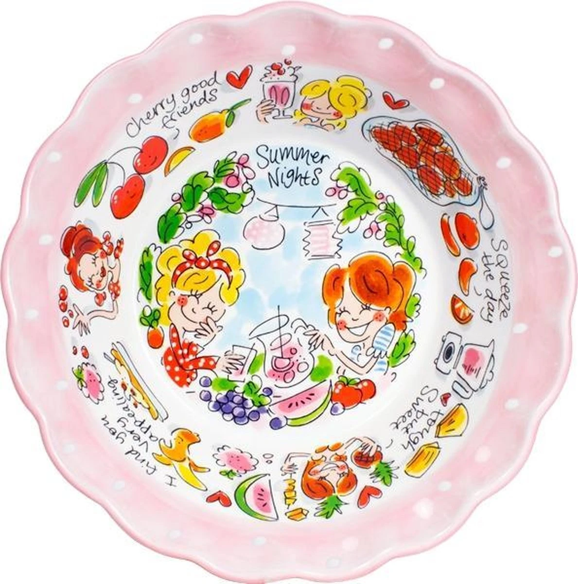 Deze leuke kom is geïllustreerd met stukjes fruit en de kenmerkende vriendinnen van de Even Bijkletsen serie. De buitenkant van de kom heeft een vrolijke, roze stippen print. De kom is perfect te combineren met de fruitschaal en sapkan, maar natuurlijk ook met de rest van het Blond servies.