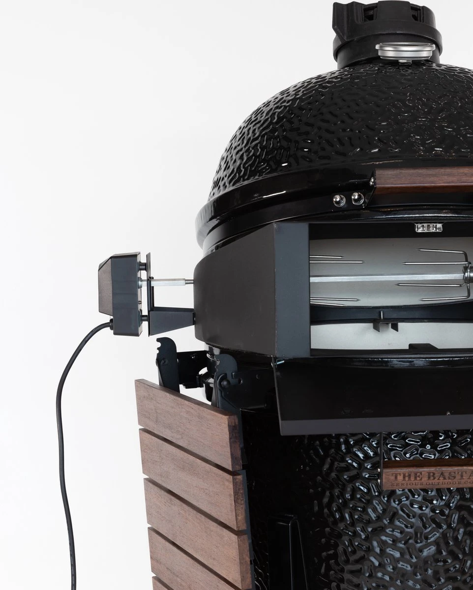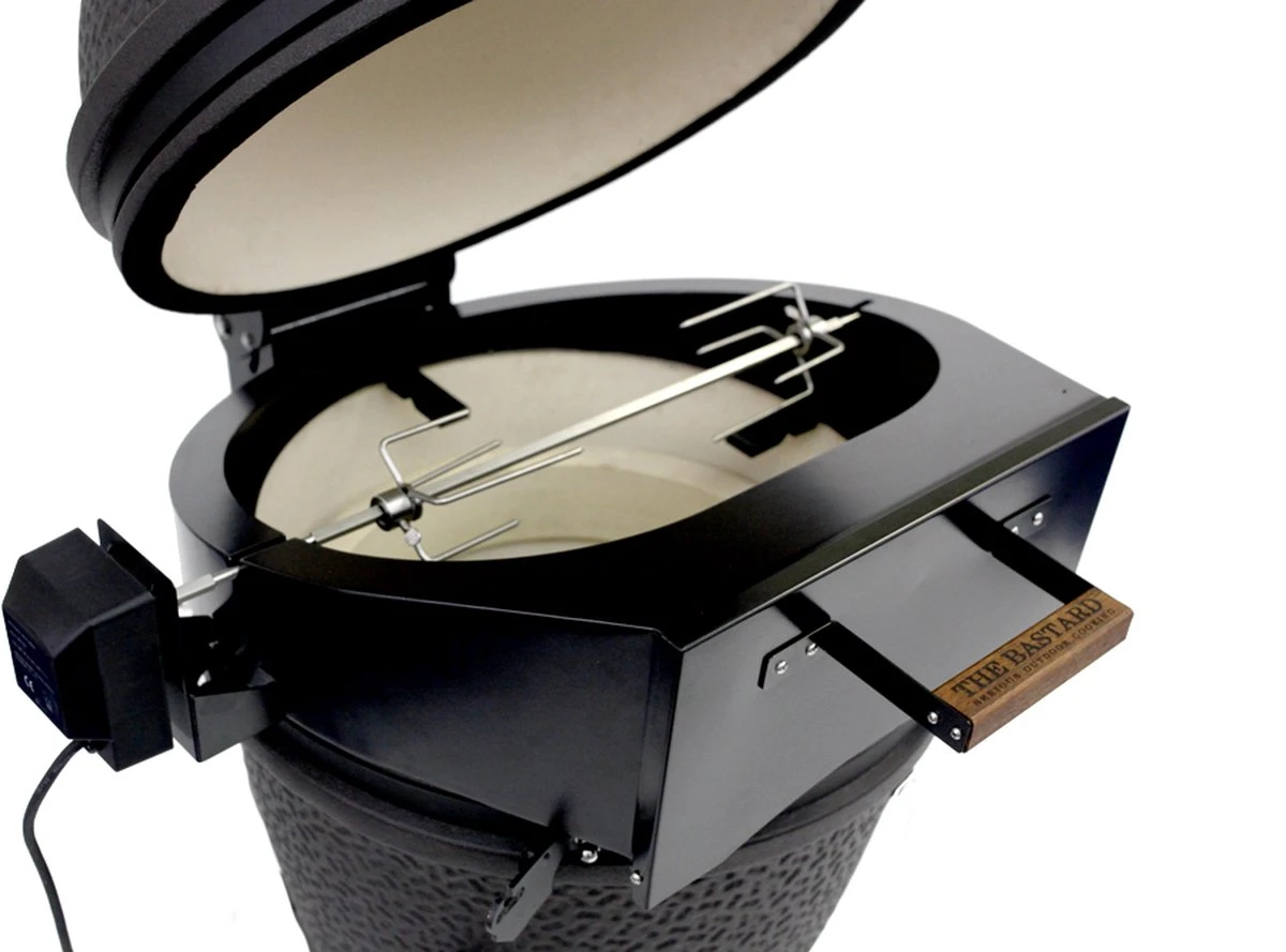 De Bastard rotisserie verzekert niet alleen de perfecte grill door voorzichtig roterend voedsel boven het vuur, het transformeert je kamado in de perfecte pizzaoven. De deksel blijft gesloten, je kunt het deurtje openen en je pizza er super makkelijk in schuiven zonder warmte te verliezen!